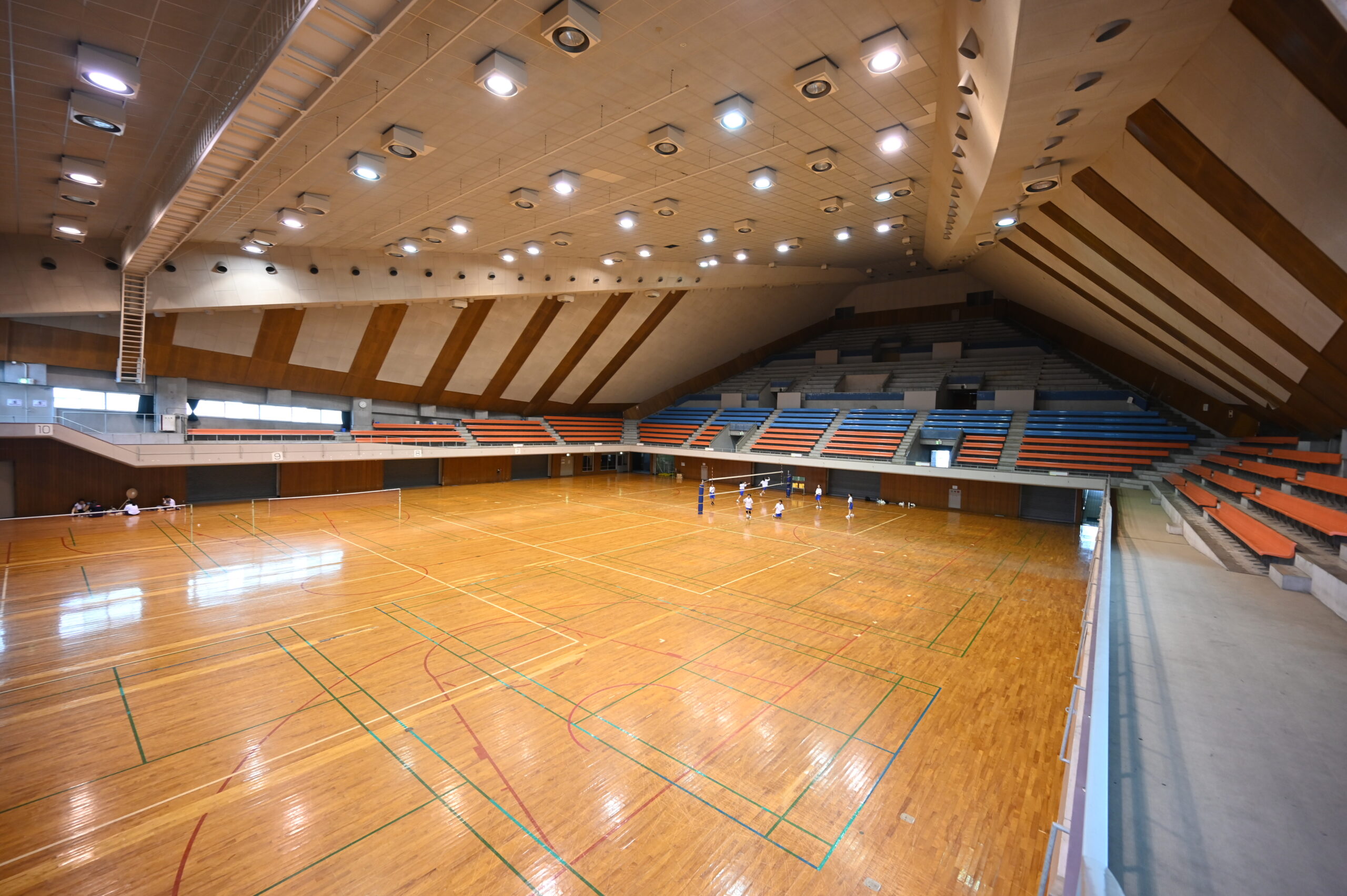 一言では言い表せない建物の形。HPシェル構造の直線から曲面に変形する金色に輝くユニークな屋根と外観。ダイナミックな建物の構造。その構造と一体となった壮大な内部空間。現在、一般的によく見られるアリーナ部分を均等に囲む客席や天井高が一定の、均質な内部空間の体育館とは一線を画する個性的な体育館だ。