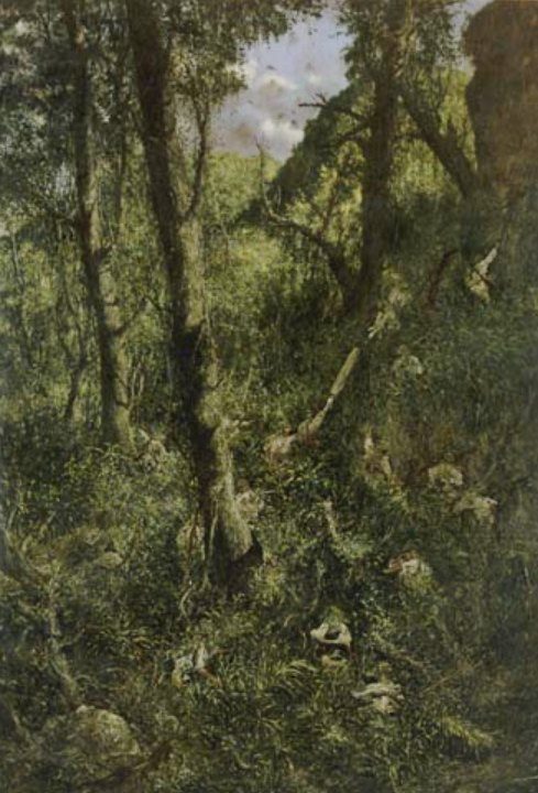 その一つが向井潤吉の「マユ山壁を衝く」です。向井は“史上最悪の作戦”と云われるインパール作戦に従軍し、この絵を描きました。一見するとこの絵は、南方の密林内の風景を描いただけの様に見えますが、近付いて良く見ると、数人の日本軍兵士が木の枝でカムフラージュして、林床の藪の中に溶け込んでいるのに気づきます。まるでトロンプルイユ(だまし絵)の様ですが、僕はすぐシェークスピアの「マクベス」の劇中、イングランド軍が森に擬装してマクベスの城を攻める場面を連想しました。