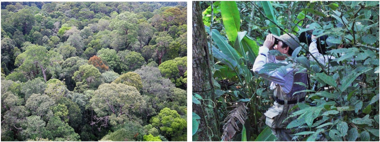 熱帯雨林で藪に身を隠し樹上のサルを撮影中
