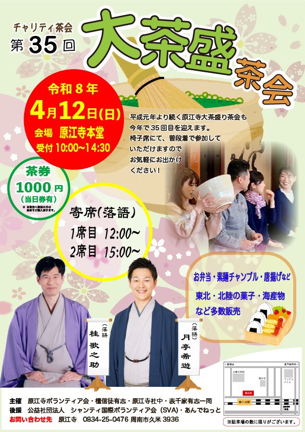 今回は4/12(日)に周南市・原江寺で開催されるチャリティ茶会【大茶盛茶会】についてです。