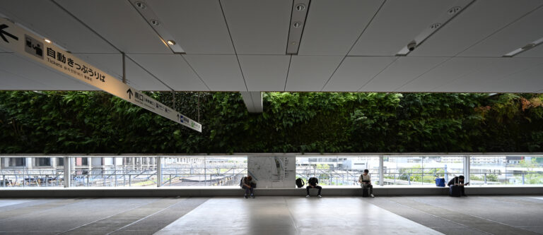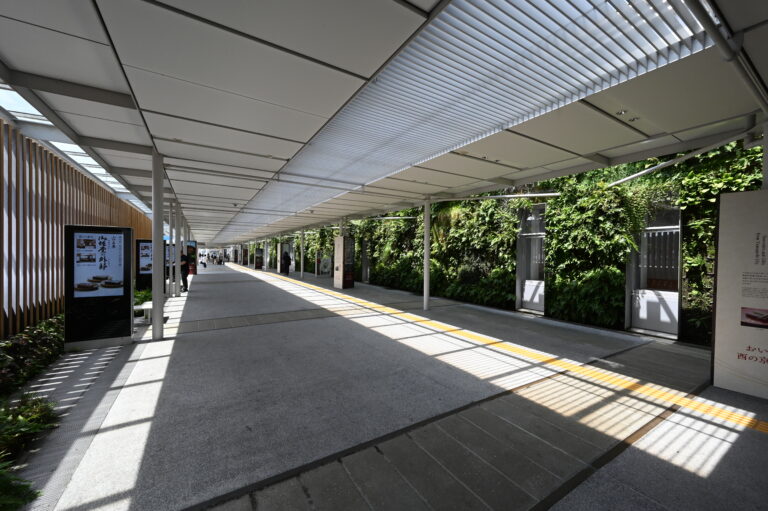 公共の建築空間でこれだけデザインされた瑞々しい緑の空間は日本では稀だ。特に駅の自由通路となると巨大なターミナル駅では、売店やカフェが入った賑わいの空間になることもあるが、地方駅では味気ない通り抜けるための通路空間、場合によっては、屋根が掛かったちょっとお金をかけた歩道橋といった場合も…。しかし、新山口駅ではハイパー南北自由通路!